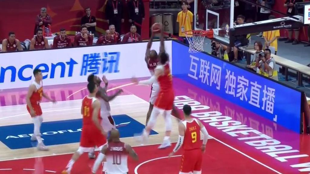 Si algo tuvo este partido fue la capacidad reboteadora de Venezuela ante los gigantes chinos. La diferencia física era abismal, pero Venezuela se opuso a los centímetros de diferencia. En esta jugada Miguel Ruiz supera a Zhelin Wang de 2,12 frente a los escasos 2 metros del venezolano.