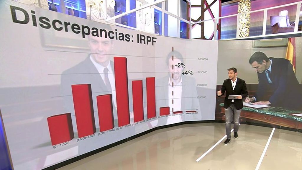 El primer punto en el que no coinciden es la subida de salarios: El PSOE propone subir el salario mínimo hasta 1.068 euros, mientras que la formación morada considera que debe haber una reforma laboral íntegra. Por otro lado, tampoco coinciden en la subida del IRPF, pues hasta ahora se había subido a las personas que ganaran más de 130.000 euros al año. El PSOE plantea aplicarlo en los millonarios , es decir, gente que no tributa por rentas.