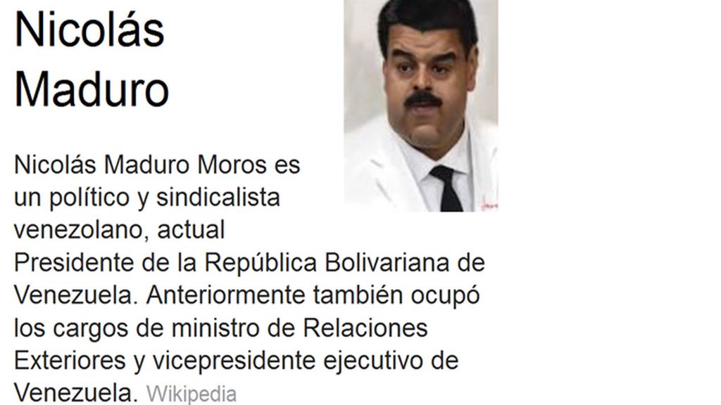 Se trata de una caricatura que aparece al teclear el nombre de Nicolás Maduro en el buscador junto a otras imágenes dentro del perfil biográfico que ofrece Google. "Otros líderes y personajes públicos cuentan con semblanzas similares en los espacios de Google, pero ninguna de estas imágenes son presentadas para la mofa", afirman desde AVN.