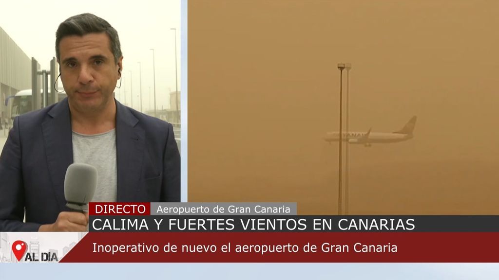 La densa calima unida a vientos muy fuertes, de hasta 160 kilómetros por hora, han activado la alerta meteorológica en las islas Canarias, con problemas sobre todo en Gran Canaria. Su aeropuerto fue reabierto esta mañana pero se suspendía de nuevo su operatividad, ya que la visibilidad es cada vez mas escasa.