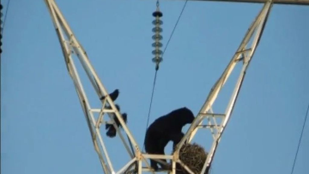 Un oso escala una torre de alta tensión para llegar a un nido de cuervos