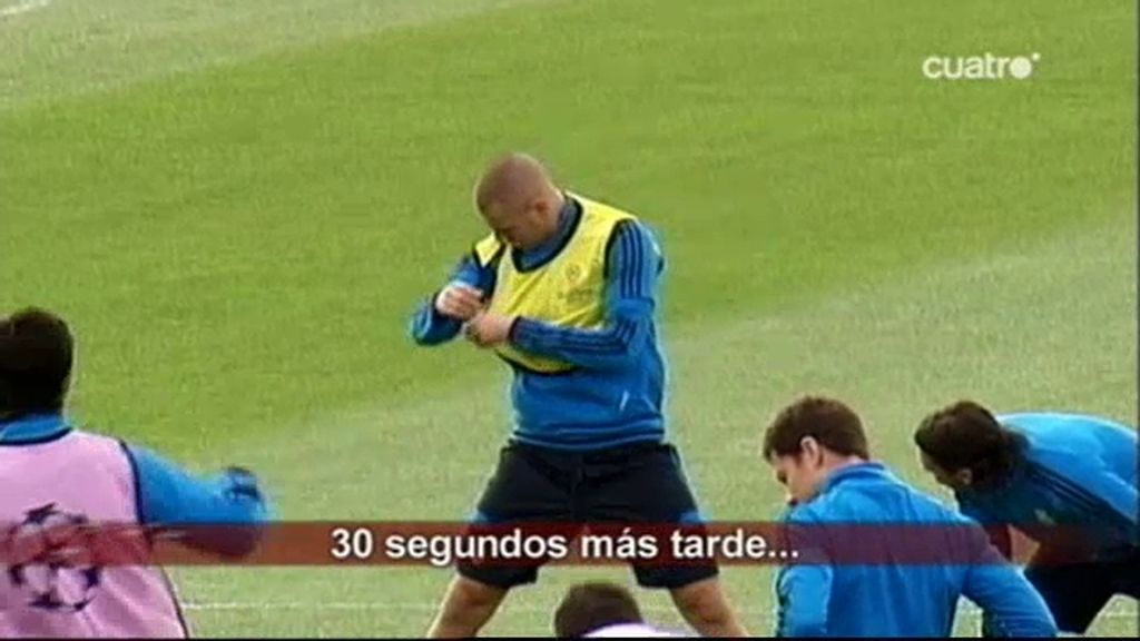 cuatro.com02/11/201119:13 h.Karim Benzemá y el peto de entrenamiento no se llevan muy bienEl delantero blanco estuvo más de 30 segundos intentando ponerse el peto