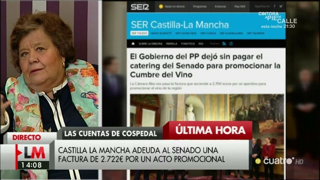 Castilla La Mancha adeuda al Senado una factura de 2.722 euros por un catering que no se pagó en 2015. El catering se organizó para presentar la cumbre del vino en Toledo. "Es como cuando Carmen Polo se iba de joyería en joyería y tenían que cerrar antes de que llegara. Vamos a necesitar una especie de consorcio ante los ‘sinpas’ que se pueden producir", comenta Cristina Almeida.
