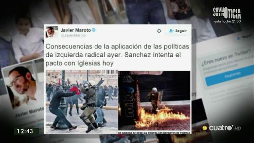 Acompañado de dos imágenes de disturbios en Grecia, Javier Maroto, vicesecretario de Acción Sectorial del PP, publicaba en su perfil de Twitter: “Consecuencias de la aplicación de las políticas de izquierda radical ayer. Sánchez intenta el pacto con iglesias hoy”.