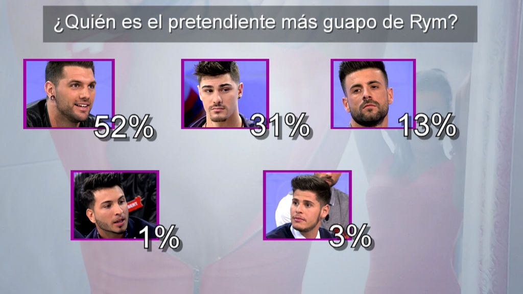 En la encuesta que preguntaba cuál de los pretendientes de Rym era el más guapo, Albert se ha ganado el primer puesto con un 52% de los votos. Joni, con un 31%, ha quedado en segundo lugar, seguido por Rubén que ha obtenido un 13%, Mohamed con u 3% y Pedro, que solo ha obtenido un 1%.