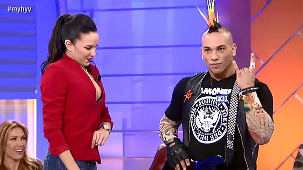 El pretendiente ha intentado impresionar a su tronista y qué mejor manera que con su estilismo de rockero. Ha estado tres horas prepparando su look punky: cresta de colores, tachuelas, una malla con tatuajes de pega, piercings, guitarra... Se ha metido en el papel.