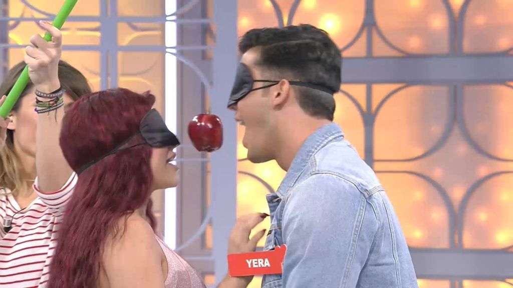 ¿Quién no ha jugado de niño al juego de la manzana? Rym y Yera han retrocedido unos años en el plató de 'Mujeres y Hombres y Viceversa' y han tratado de comerse la manzana con los ojos vendados, dificultad que ha llevado a que sus labios se rozasen en varias ocasiones.