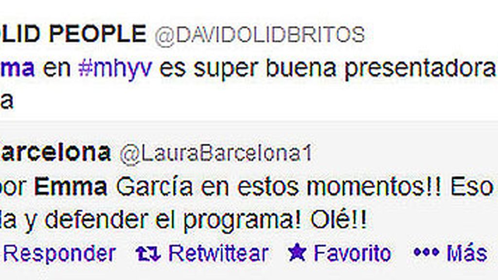 El sentimiento más sincero de la mañana que ha llevado a sus seguidores en Twitter a mandarle cientos de mensajes de apoyo en la red social: “Emma no te mereces esto”, “Con lo que está pasando y aguanta sin llorar, qué gran mujer”, “Emma García es una pedazo de profesional”, “No me extraña que #myhyv sea TT Con el programa de hoy... Menos mal que tenemos a una gran presentadora”, “Pobre @_EmmaGarcia_ lo hace todo por el programa y no le dan nada...", "Es la mejor presentadora y sin ella el programa no valdría nada animo Emma"...