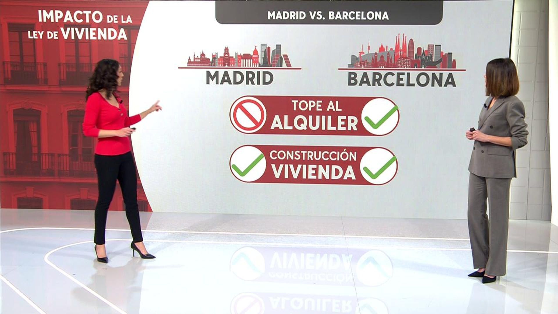 Diagnósticos distintos de dos ciudades que apuestan por modelos de vivienda diferentes. La diferencia principal es que Madrid no aplica la medida estrella de la ley estatal de vivienda, el tope al alquiler en las zonas tensionadas y Barcelona sí convirtiéndose en su medida troncal.