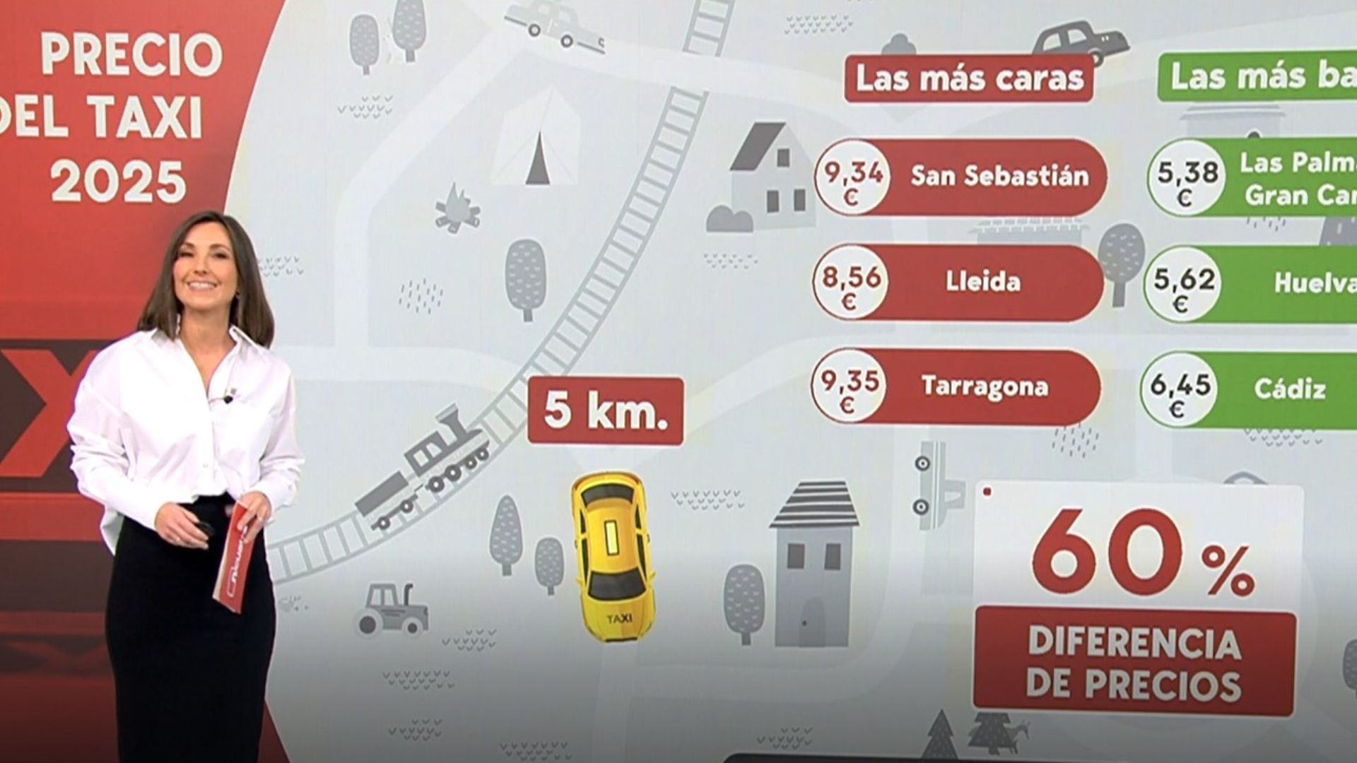 El análisis en el que aparecen San Sebastián, Lleida y Tarragona como las más caras y Las Palmas de Gran Canaria, Huelva, Cádiz y Melilla como las más baratas se basa en una combinación de la carrera mínima o trayecto de 1 km, trayecto de 5 km y trayecto de 10 km, tanto en horario diurno y nocturno como en fin de semana.