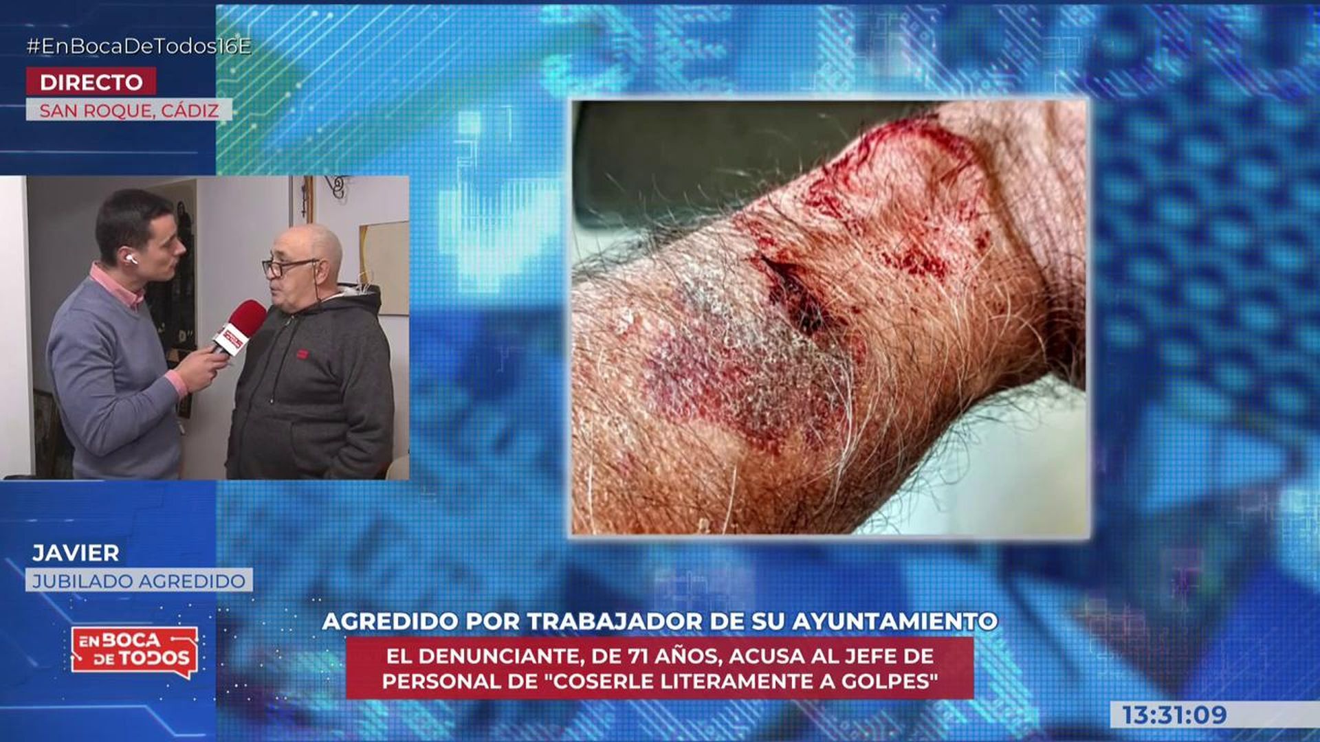 "Me intentó quitar el móvil a lo bestia, me agarró del cuello, me clavó las uñas en el brazo...", detalla Javier durante esta intervención en directo, que asegura que nunca antes había tenido problemas con este trabajador del ayuntamiento. Un equipo del programa ha contactado con el ayuntamiento para saber su opinión al respecto, pero "se lavan las manos, no quieren saber nada". Por ahora, hay una denuncia por un delito leve de lesiones, aún no hay fecha de juicio y Javier se encuentra a la espera de recibir un informe por parte de de un forense. Para rematar, el entrevistado apunta que este trabajador es marido de la secretaria del gobierno del municipio y denuncia que es un puesto dado "a dedazo".
