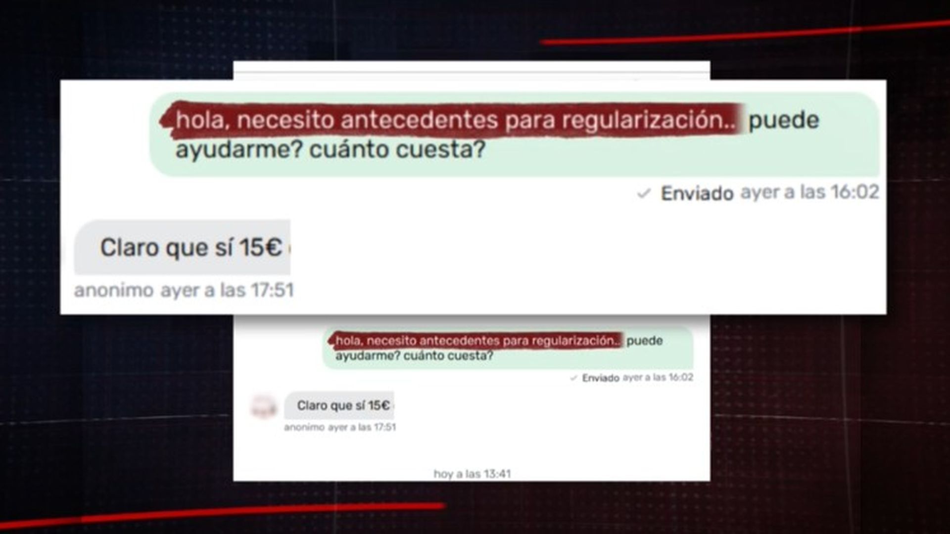 'Hola, necesito antecedentes para regularización. ¿Cuánto cuesta?', le pregunta un interesado como podemos ver en el vídeo que acompaña a esta noticia. 'Son 15 euros, puedo realizarle el certificado de antecedentes, y yo editarlo para borrarle lo que quieras', contesta el estafador.
