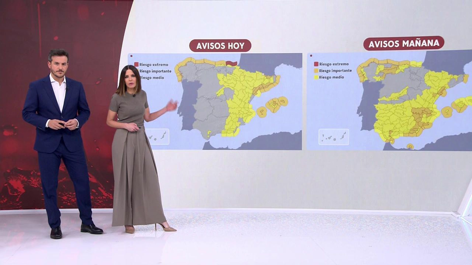 Al margen de ello, el pronóstico prevé bancos de niebla matinales en zonas de montaña de la vertiente atlántica, con brumas frontales en amplias zonas del territorio. En Canarias habrá tiempo estable, con cielos nubosos o con intervalos nubosos y posibilidad de alguna llovizna en los nortes de las islas montañosas y, en general, cielos poco nubosos en el resto del archipiélago.