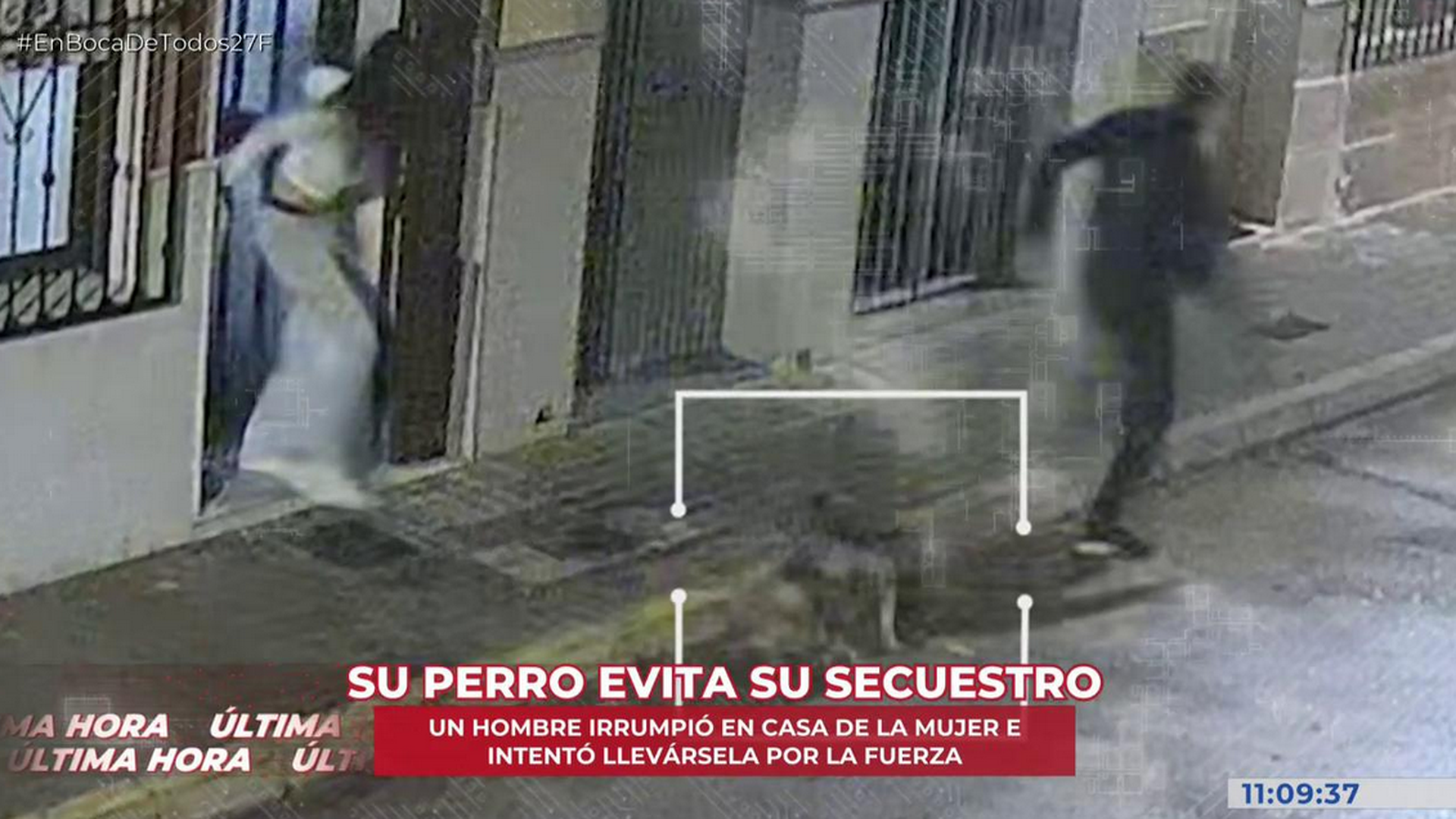 Un hombre cruza la esquina y otros tres le esperan, la situación es muy sospechosa. Se para delante de una puerta, llama y antes de que terminen de abrir, empuja a la mujer que hay dentro y se cuela en la vivienda. Los otros tres encapuchados se acercan a la puerta con la intención de llevarse a la joven a la fuerza, pero el primer hombre sale de la vivienda corriendo y con un perro enganchado en la pierna y la joven que iba a ser secuestrada corriendo detrás de él.