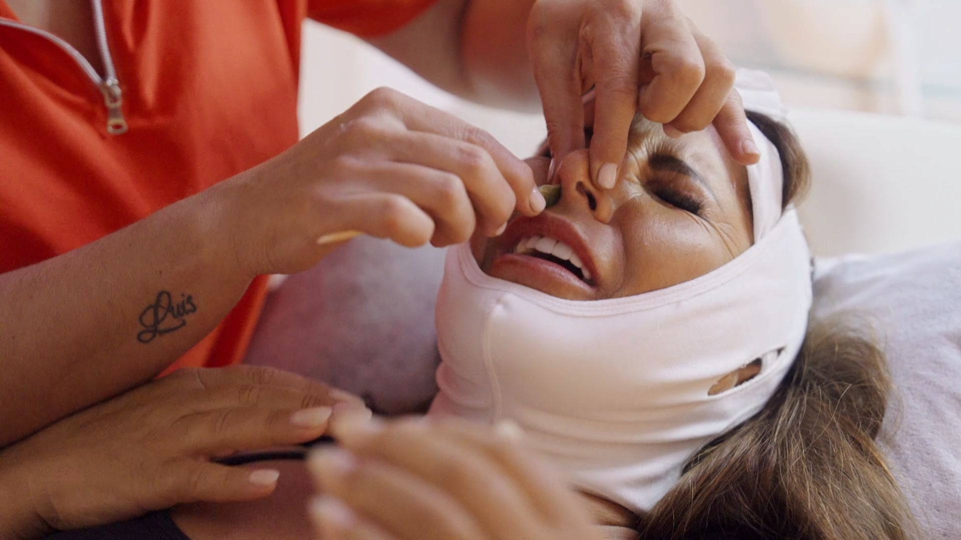 Su esteticien le recomienda realizarse un tratamiento de luminosidad y, además, le pone algo para tensar la piel de la zona y reafirmarla. "¿Esto qué es? Si es una braga de cuello alto", replica Raquel al ver la tela.