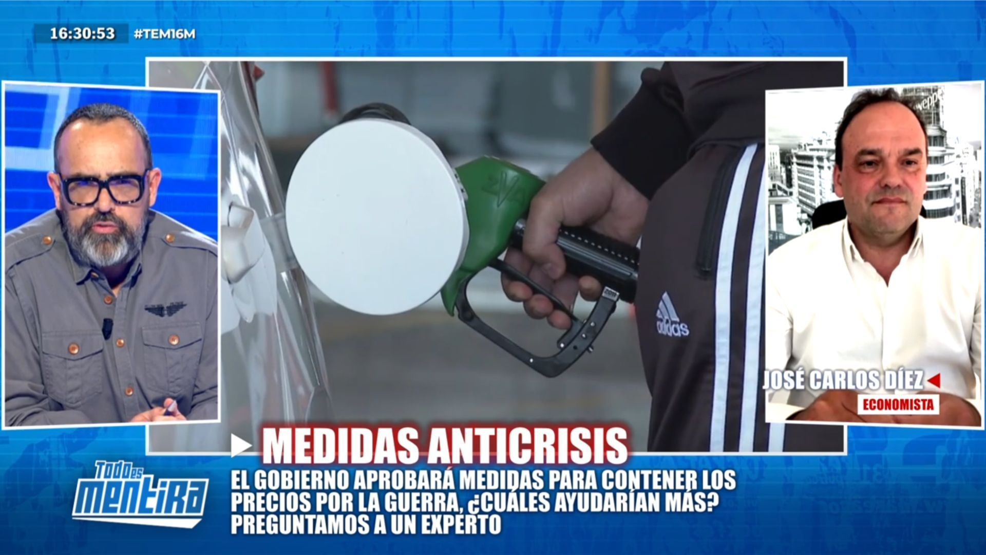 En 'Todo es mentira' conectan con un experto para saber qué medidas se deberían implementar "urgentemente" en España para que se note menos el efecto de la guerra de Irán en nuestros bolsillos. José Carlos Díaz, economista, lo tiene claro: "Vendría bien que Donald Trump y Netanyahu se arreglaran con los iraníes y que abran el estrecho de Ormuz porque si no la crisis va a continuar y luego, desde España, vamos a ver qué hace el Banco Central Europeo el jueves, que es importante a ver qué previsiones de inflación da porque en función de eso podemos ver si va a haber subidas de tipos o no, que eso también condicionaría algo la situación nuestra, y aquí pues un poco lo que se hizo en la crisis del 22".